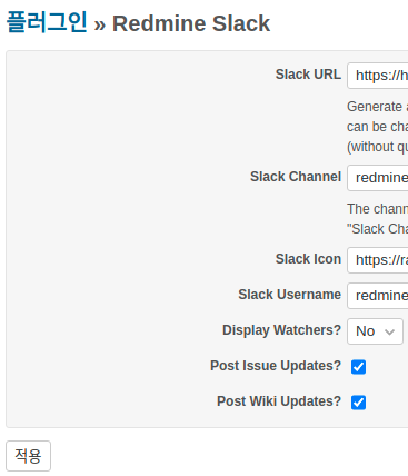 관리 > 플러그인 > Redmine Slack > 설정으로 들어간다.