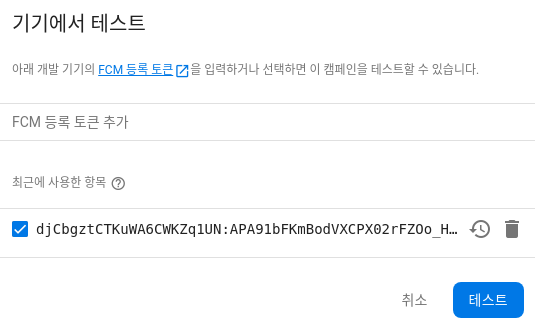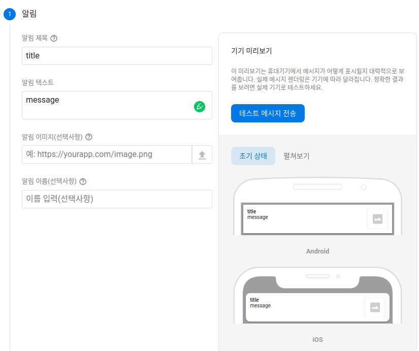 제목과 텍스트를 입력후 테스트 메세지 전송