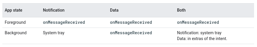 Firebase messaging에는 두가지 방식이 있다. Notification messages delivered when your app is in the background. In this case, the notification is delivered to the device’s system tray. A user tap on a notification opens the app launcher by default. Messages with both notification and data payload, when received in the background. In this case, the notification is delivered to the device’s system tray, and ..